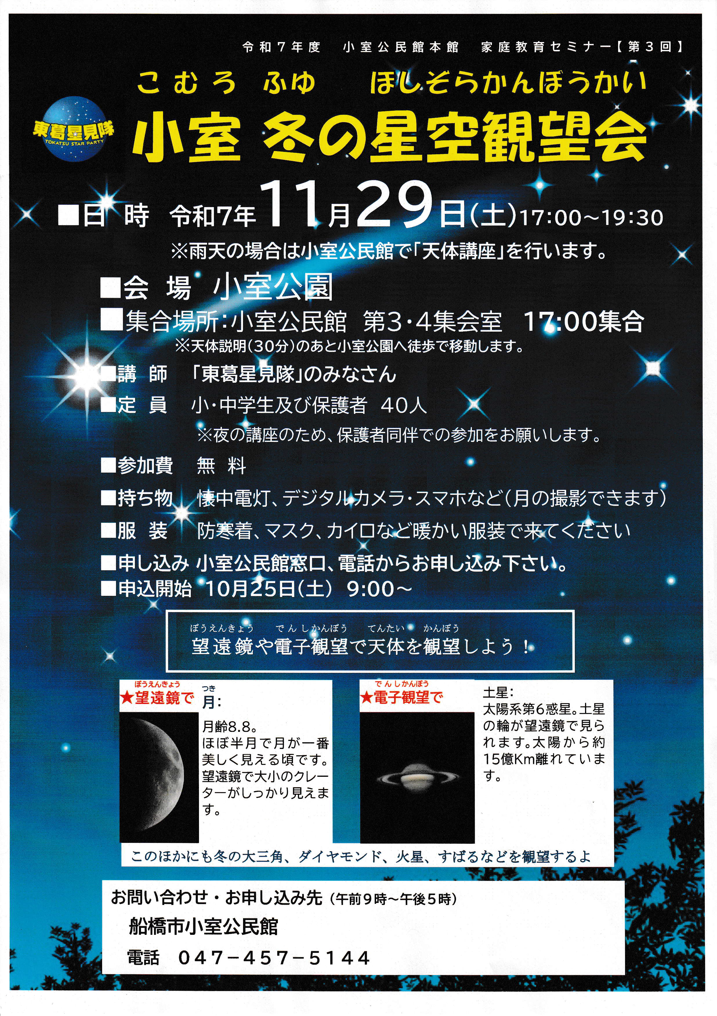 月に2~3回地域の学校や団体の要望に応じ観望会を行っています。このページでお知らせいたします。